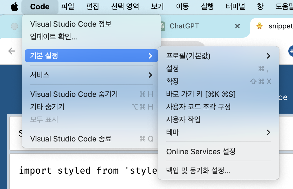 Code > 기본 설정 > 사용자 코드조각 (윈도우에서는 파일 메뉴에 있습니다!) 메뉴를 누릅니다.